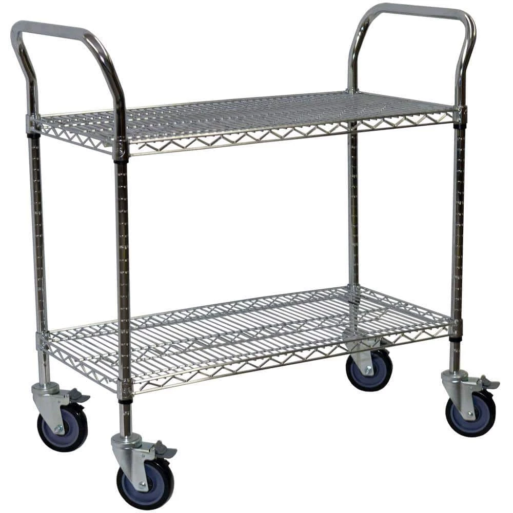 These attractive and highly functional service carts feature our chrome plated wire shelving and are built to provide years of dependable use. Open wire construction allows air circulation and reduces dust/dirt build-up. One piece “U” shaped handle is designed specifically for our service carts to provide added strength and rigidity. Shelves are adjustable in 1 in. increments. Carts include four 5 in. polyurethane swivel casters with an easy step brake. Intended for use in dry environments. Cart capacity: 600 lbs.