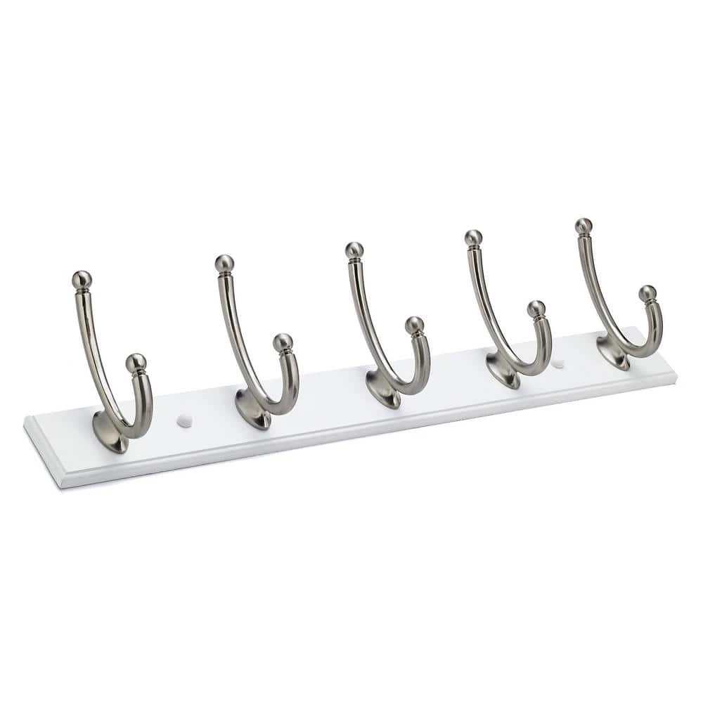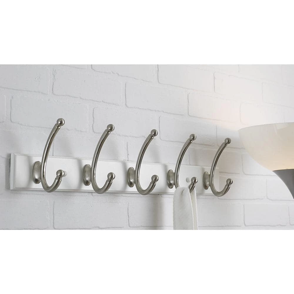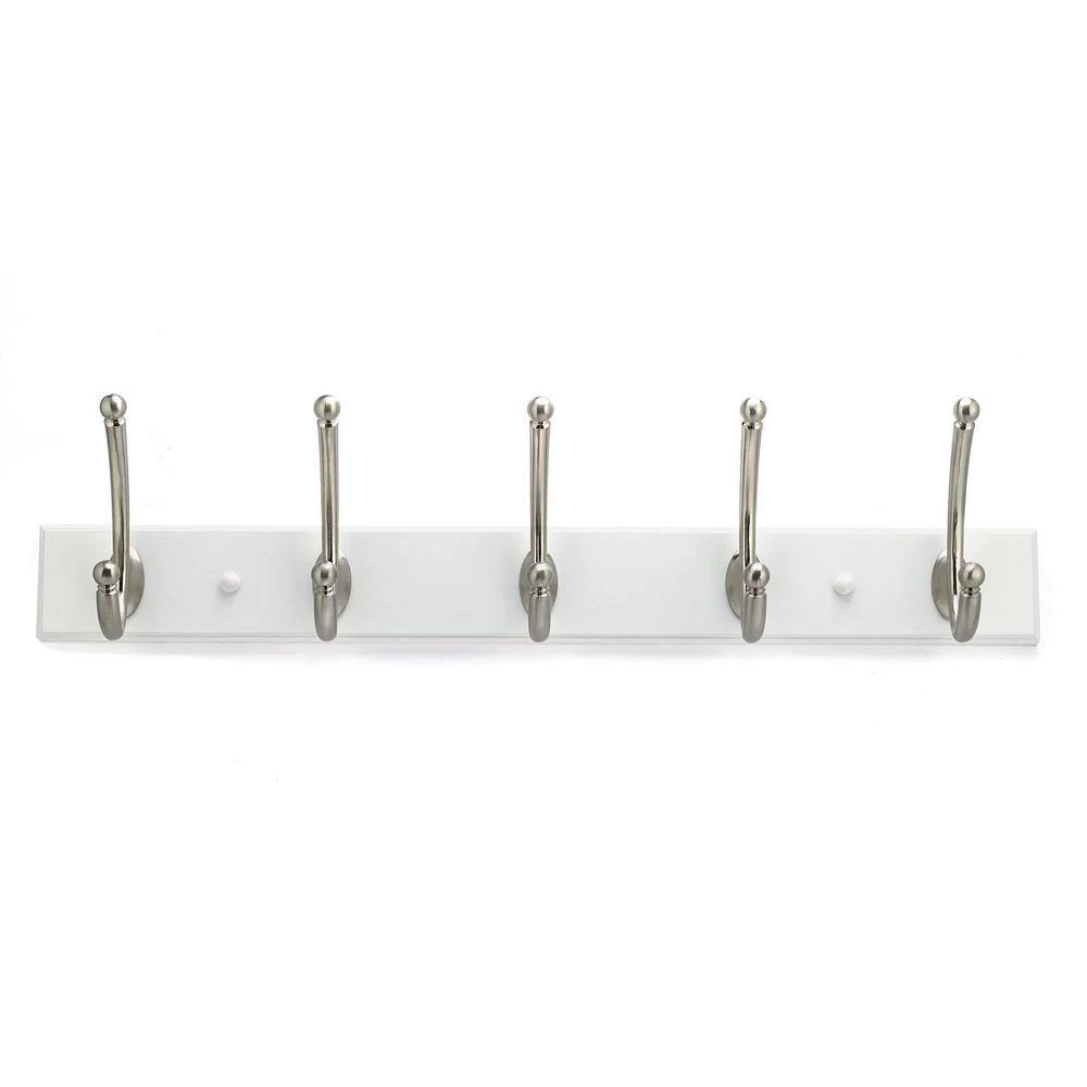 Contemporary lines with a traditional touch, this hook board features 5 brushed nickel hooks integrated on a pale or dark board. Choose the finish that best suits your home. Mounting hardware included for easy installation.