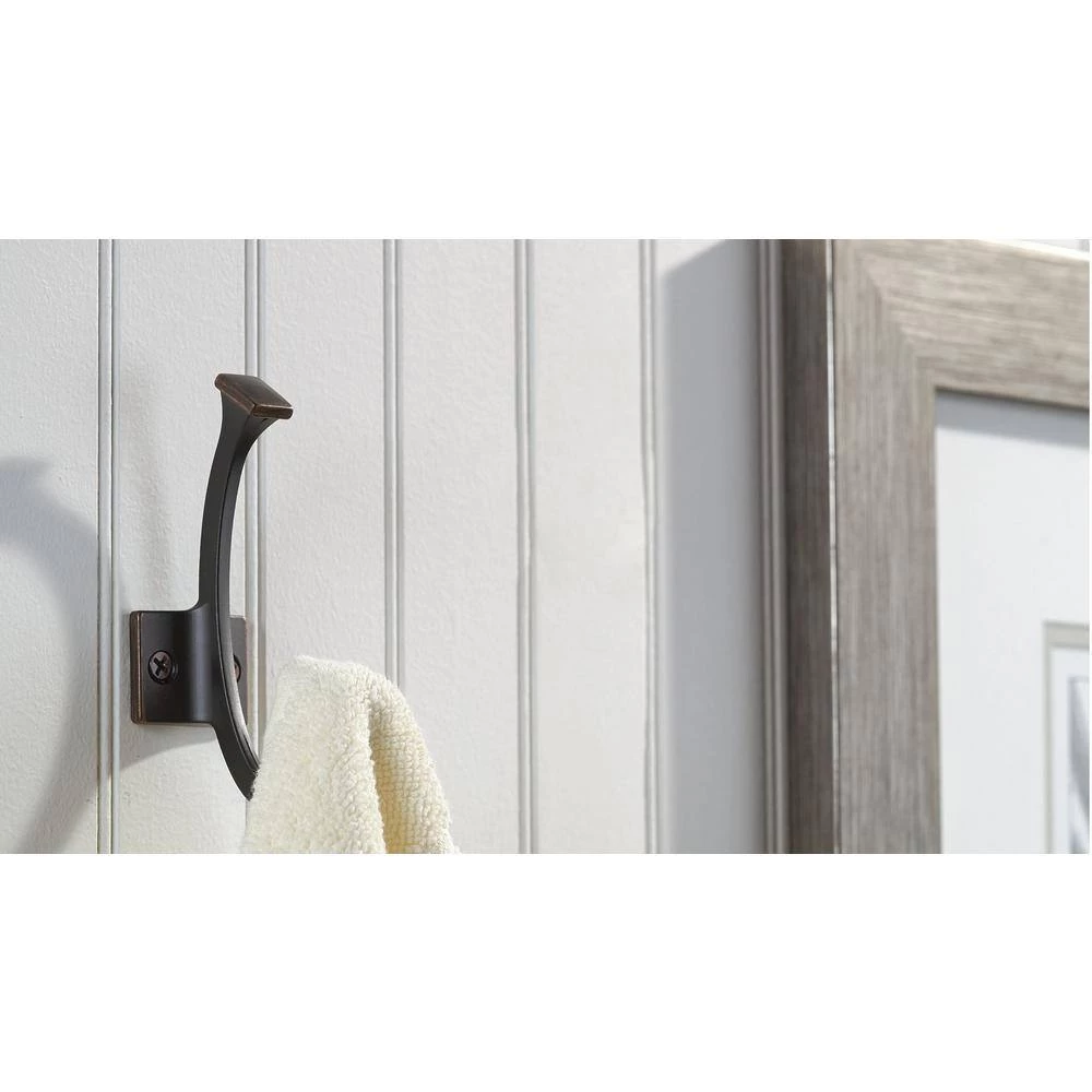 Transitional metal hook by Richelieu. The details in this hook combine modern and nostalgic elements for a unique design. Mounting hardware included for easy installation.